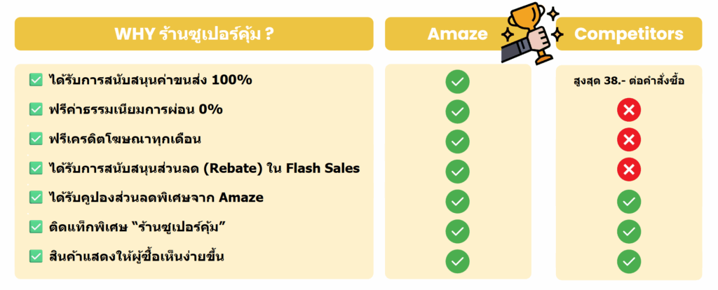 - Amaze สนับสนุนค่าขนส่งแทนผู้ซื้อทั้งหมด 100% สำหรับขนส่งที่รองรับโดย Amaze